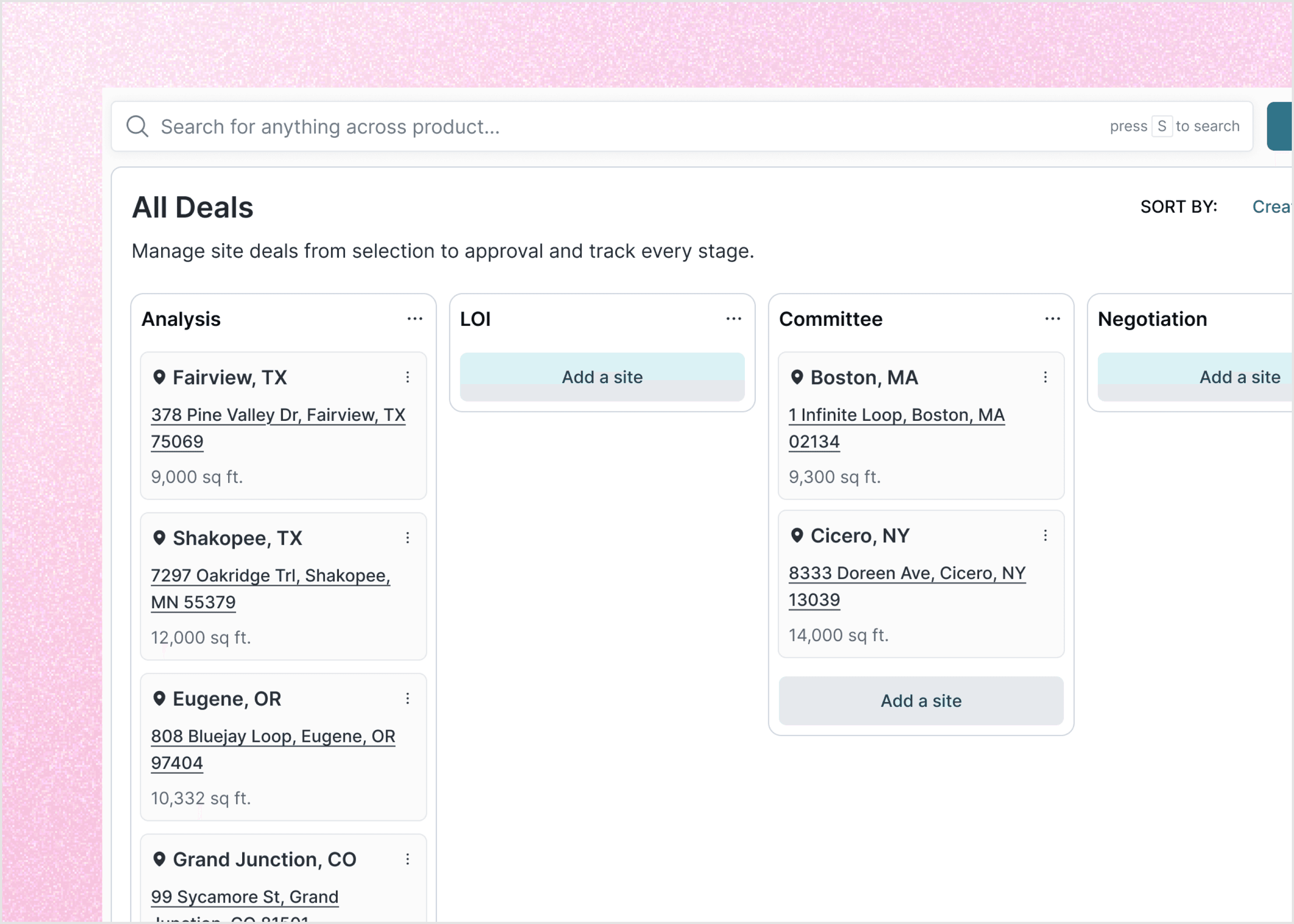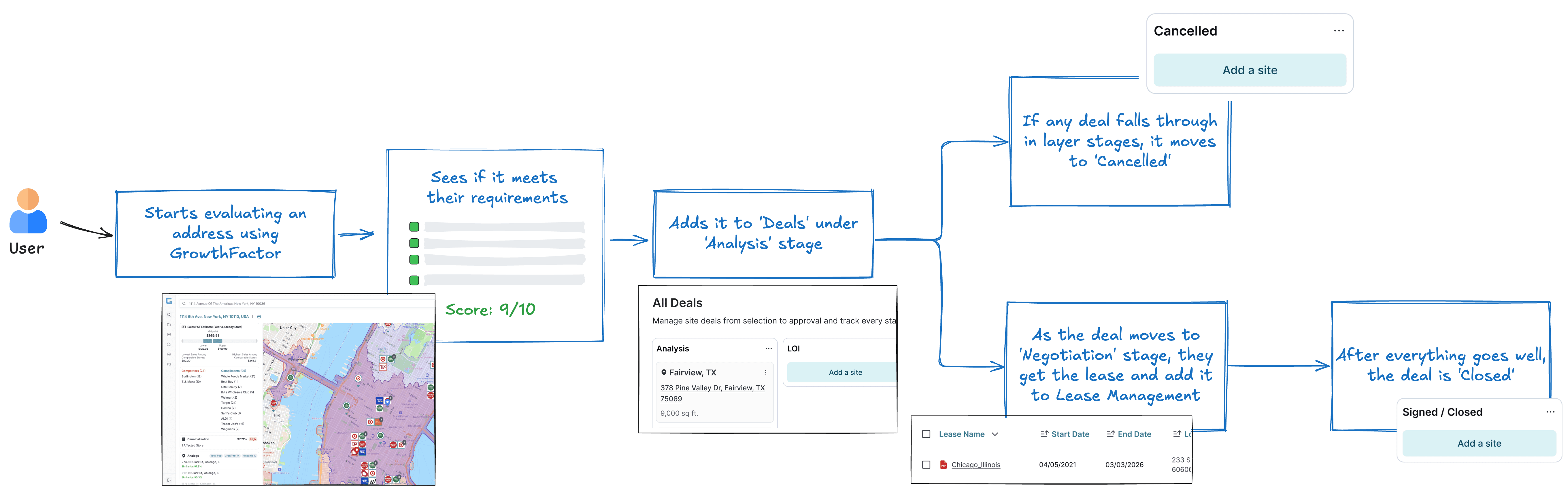 The core issue was a fragmented workflow. Users were already evaluating sites on the platform, but the subsequent lease management was a disconnected, manual process, causing significant cognitive load and inefficiency.
