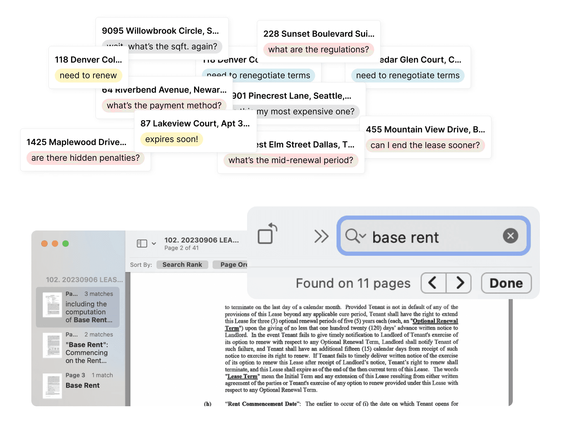 Users were painstakingly storing and manually searching through lease documents on their local devices. Existing PDF search tools were ineffective, providing only keyword counts rather than intelligent, summarized answers.