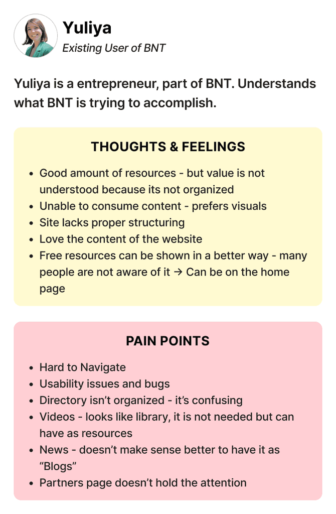 The necessity for BNT's overhaul is clear, yet we conducted interviews to pinpoint content that engages users and identify effective elements. For user interviews, we approached 2 different segments of users: