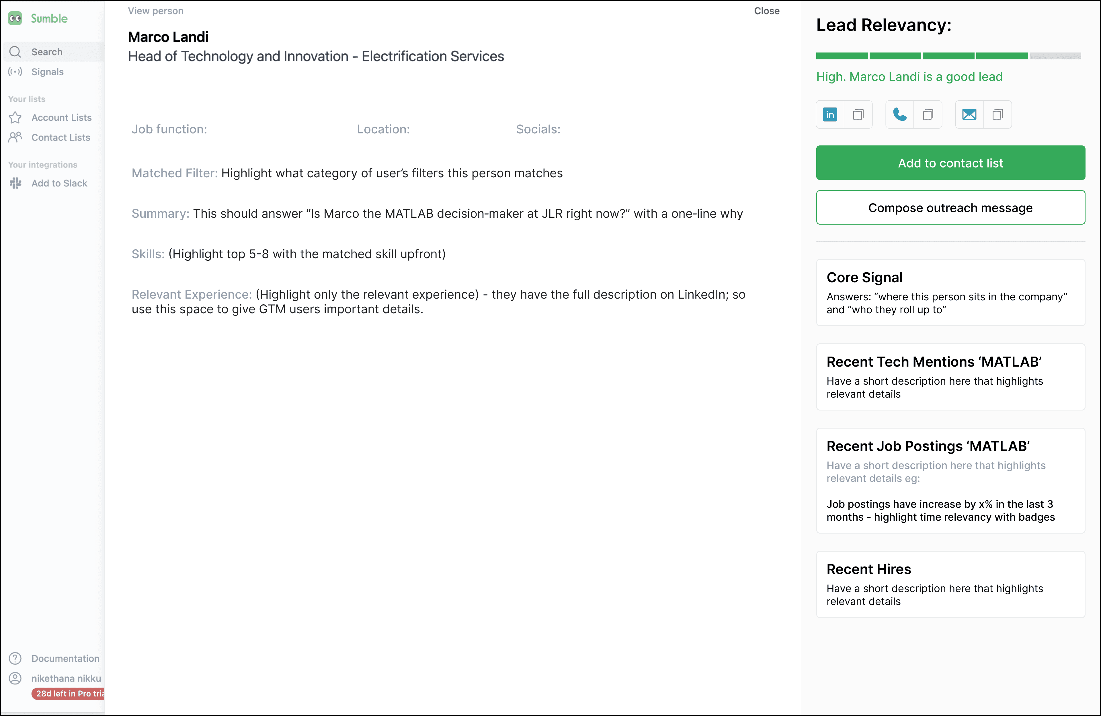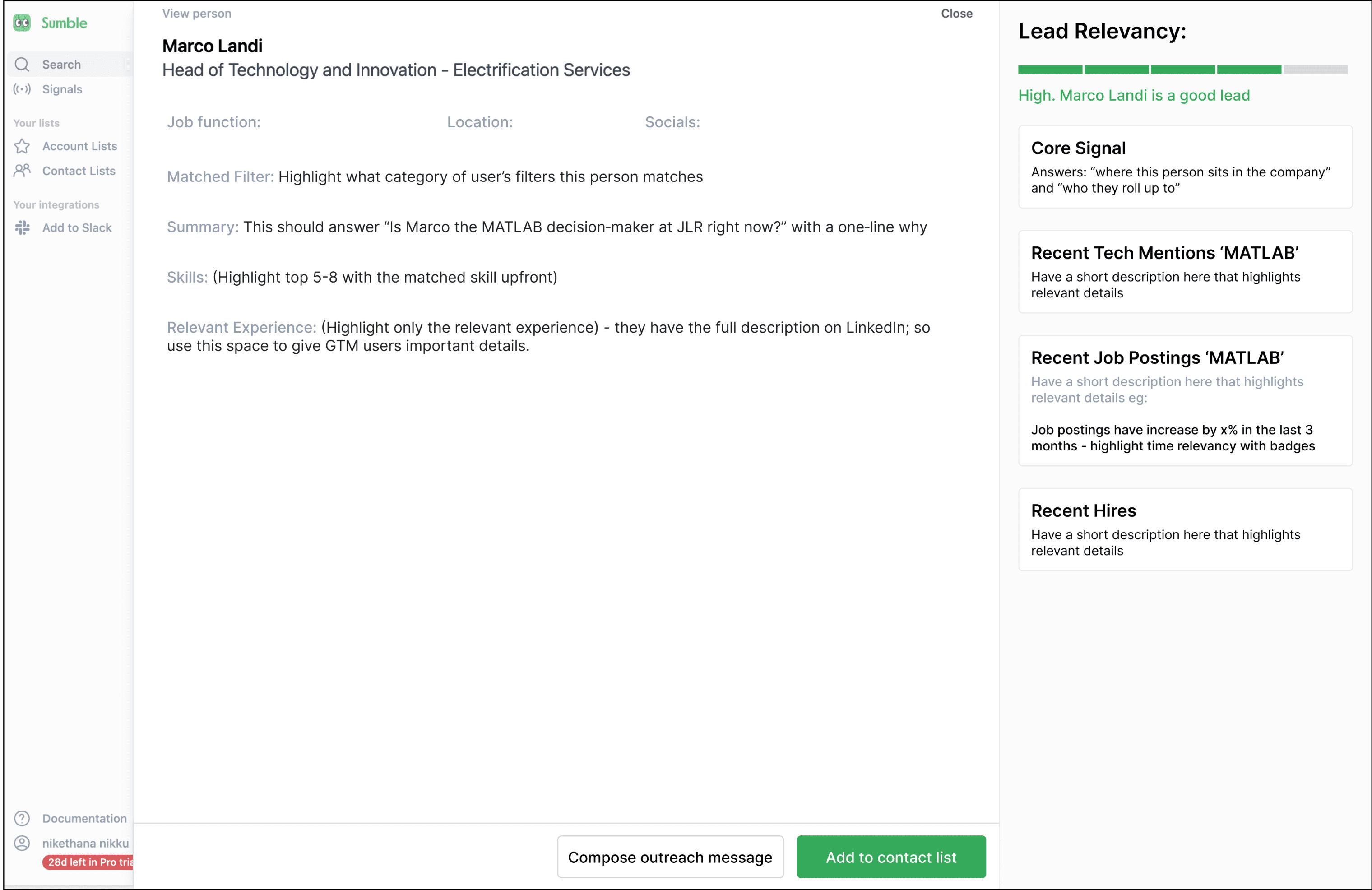 Logic over Analytics: I deprioritized historical outreach data to focus on real-time relevance. In GTM, the "Right Time" is often a transient signal (recent job posts, tech mentions ); I chose to build a robust UI for these "live" signals rather than a mediocre retrospective dashboard.