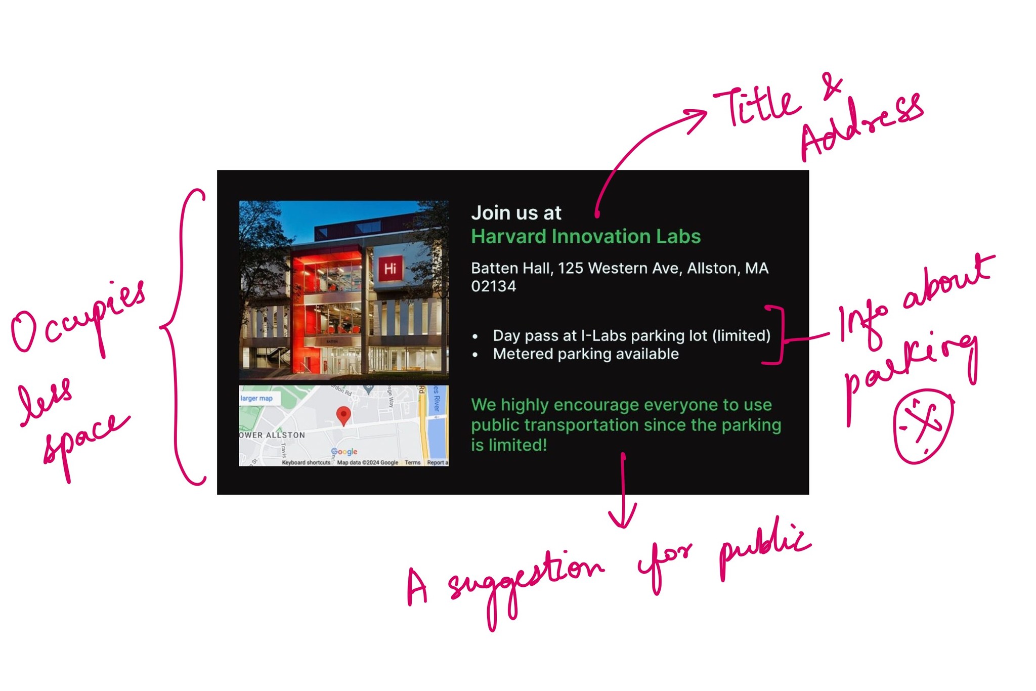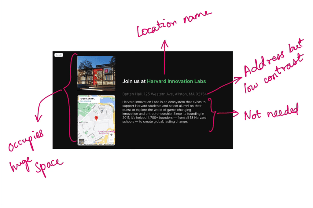 Next, I aimed to summarize the event's value upfront for users. Along with the venue, date and meals information.