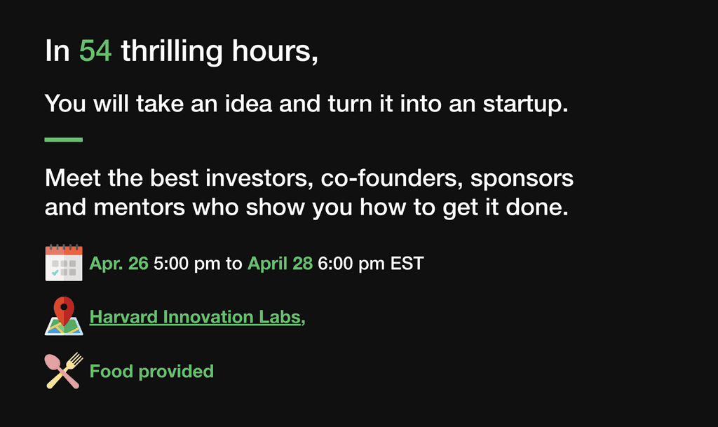 A thrilling 3 day weekend event (54 hours), where you take an idea and build it. With the help mentors, you will learn what matters while building an idea into a startup.
